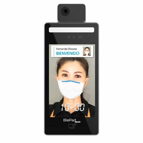 BioPad MAX Temp H soporta modo 1:1 o 1:N e integra también lector de proximidad Mifare 13.56 MHz. Tiene capacidad para medir la temperatura (de la frente) de una persona, siendo la medición estable y altamente precisa.